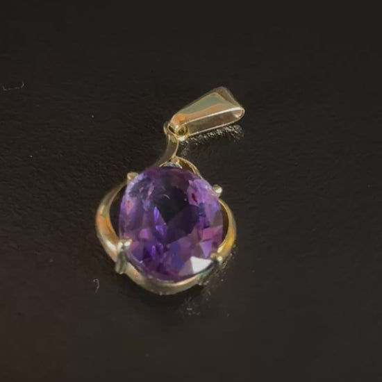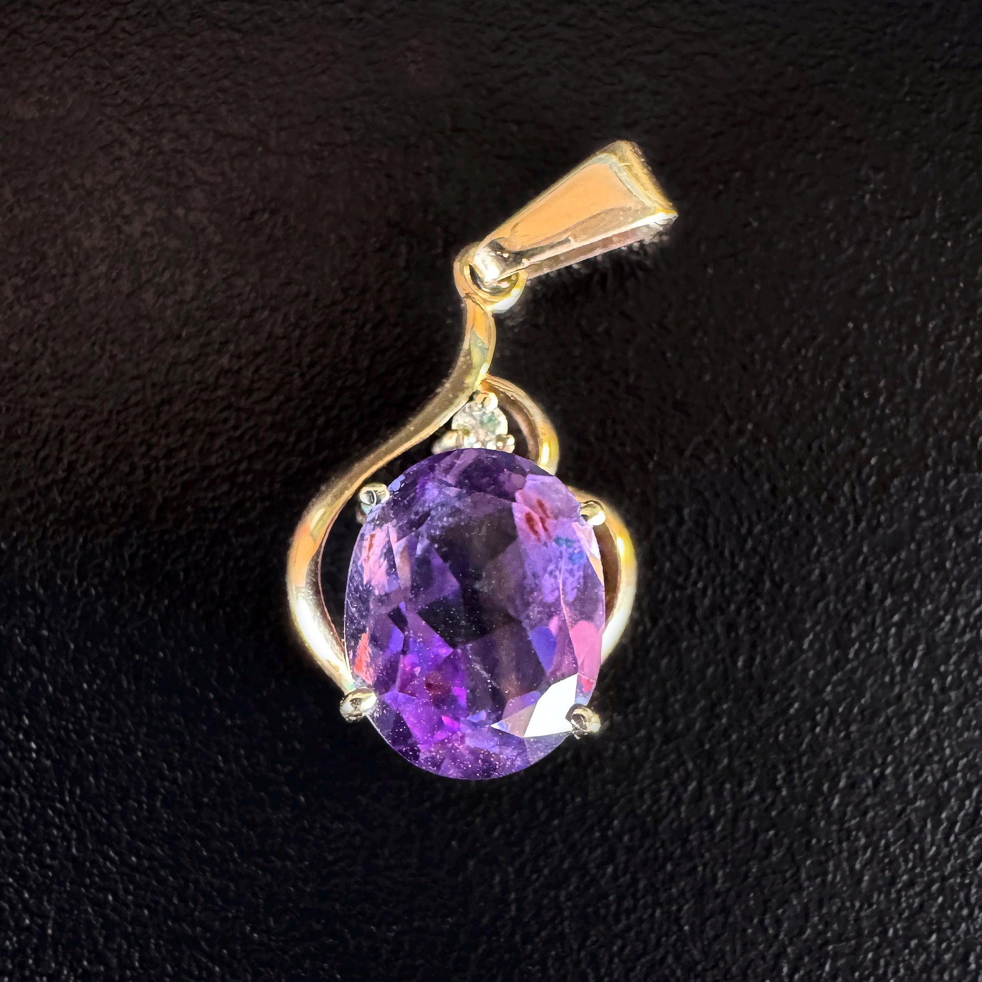 A striking modern 9ct gold pendant set with a vivid oval-cut amethyst, accented by a single brilliant-cut diamond above. The sweeping gold setting gives the piece an elegant, fluid silhouette that frames the gemstone beautifully.